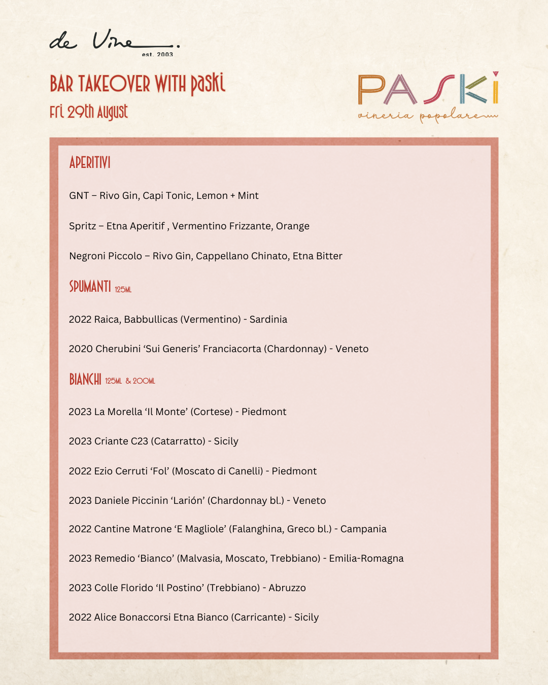 The wines on pour have been handpicked and imported by Giorgio (Giorgio De Maria Fun Wines) and Mattia (Vino Mito). Expect a line-up of expressive, natural wines that reflect craftsmanship and character.